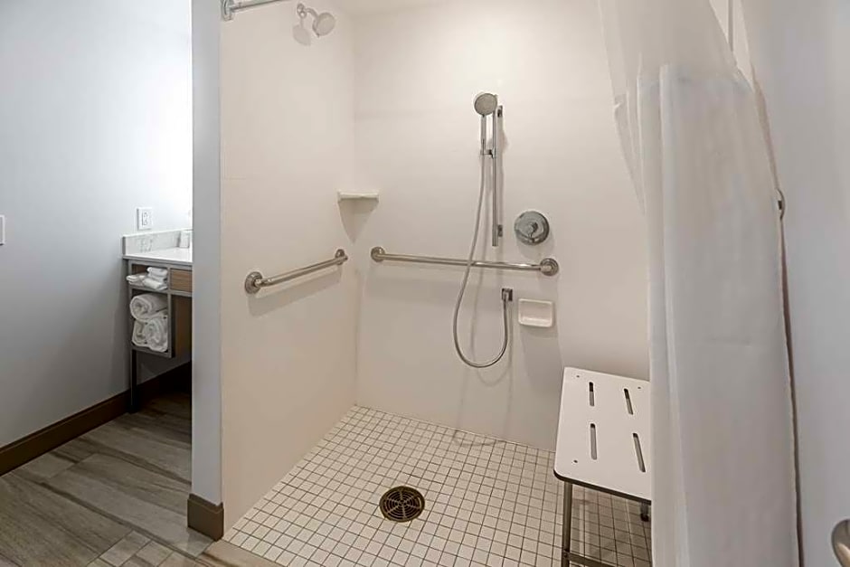 This mobility accessible whirlpool one bedroom suite features one king-sized bed, and a 3x 3 transfer shower. A 3 x 3 transfer shower with a built-in fold down seat with grab bars, plus a shower head that can be used as a handheld or fixed shower. Lowered vanity in bathroom and lowered shelf in closet. The pursuit of the perfect night's stay continues with new amenities including the bed, chair, and television. The ergonomic chair is good for your back and better for work. Enjoy your favorite television show on our 36-inch HDTV. There's also a microwave, refrigerator and coffee/tea maker to help you feel at home. A separate living area with a full-sized sofa bed, coffee table and TV. For conducting business, our rooms offer a spacious work desk, two telephones with dataport and voicemail and complimentary WiFi. Any corresponding photo may not reflect the specific accessible room type or room feature.